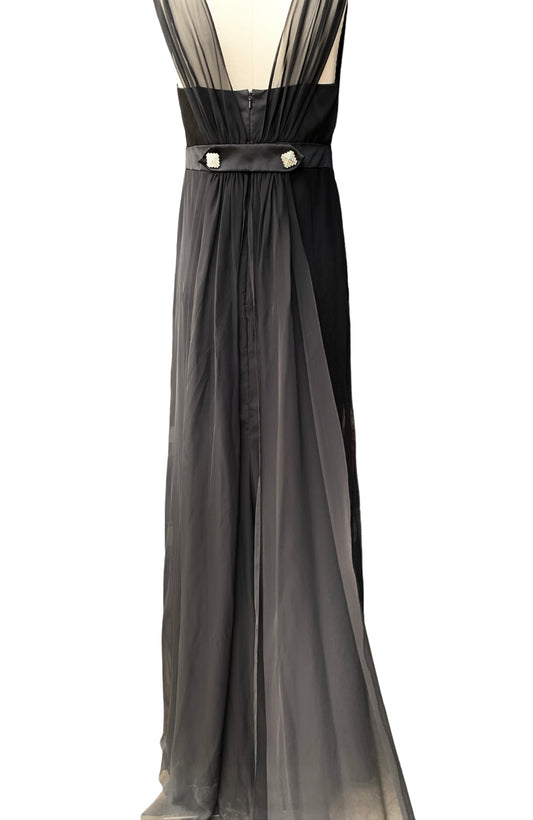 Black Empire waist satin bodice gown with chiffon skirt overlay and Grecian cascades over bust & shoulders, belted with gemmed accents buttons at back waist