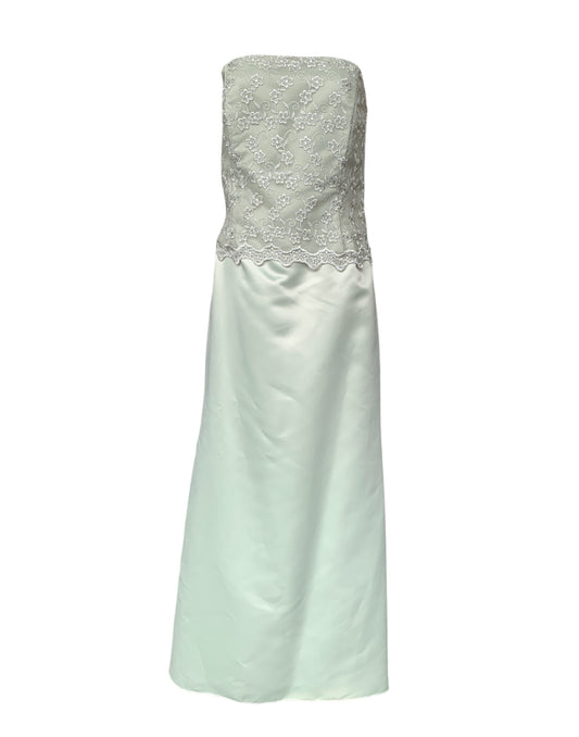 Pea green satin gown with lace overlay & bolero