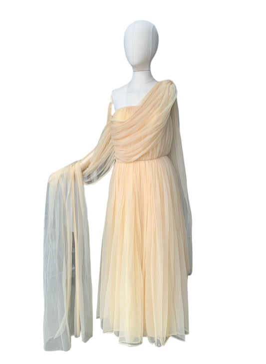 Buttermilk Grecian strapless gown with cascade