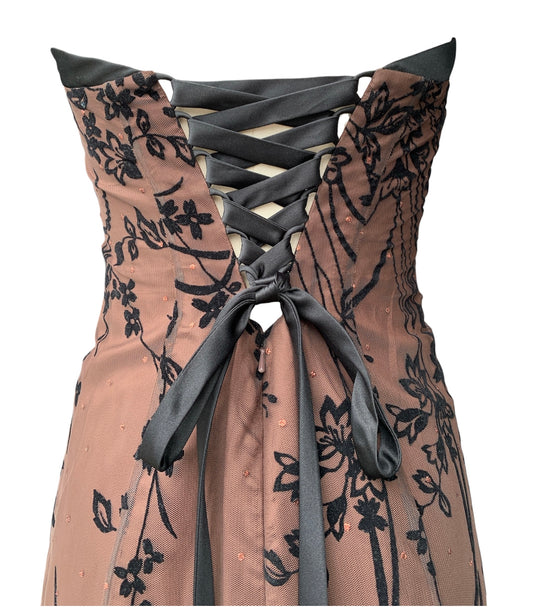 Bronze strapless gown with black accents, flocked floral overlay & corset-lace back